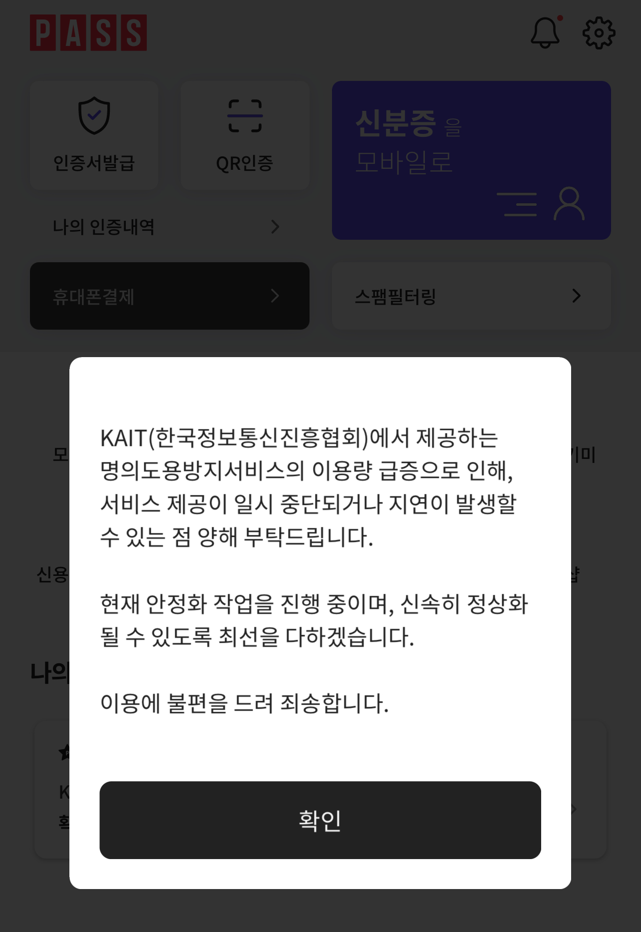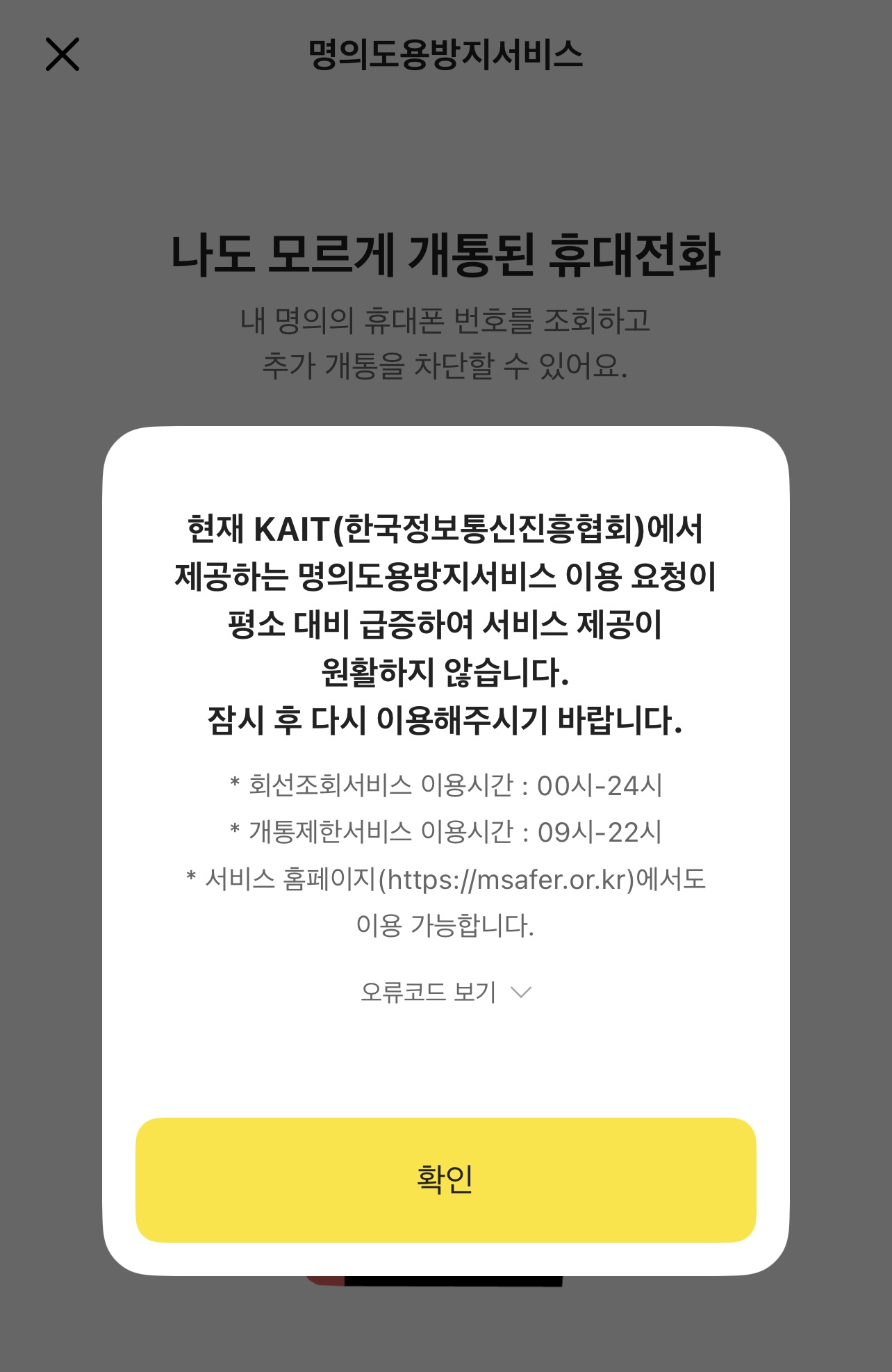현재 KAIT에서 제공하는 명의도용방지서비스 이용 요청이 평소 대비 급증하여 서비스 제공이 원활하지 않습니다.